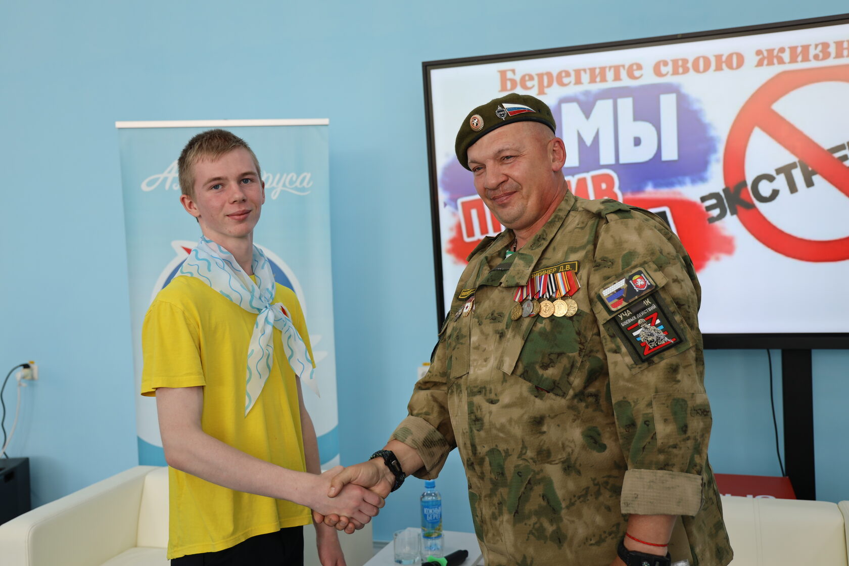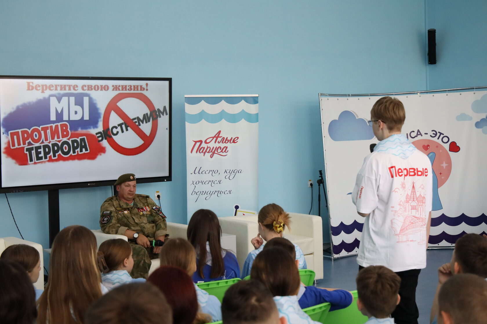 В рамках мероприятий, посвященных Году защитника Отечества, в «Алых парусах» прошла встреча участников смены с Дмитрием Владимировичем Пикинером, - начальником отдела антитеррора и экстремизма Крымпатриотцентра, участником специальной военной операции.