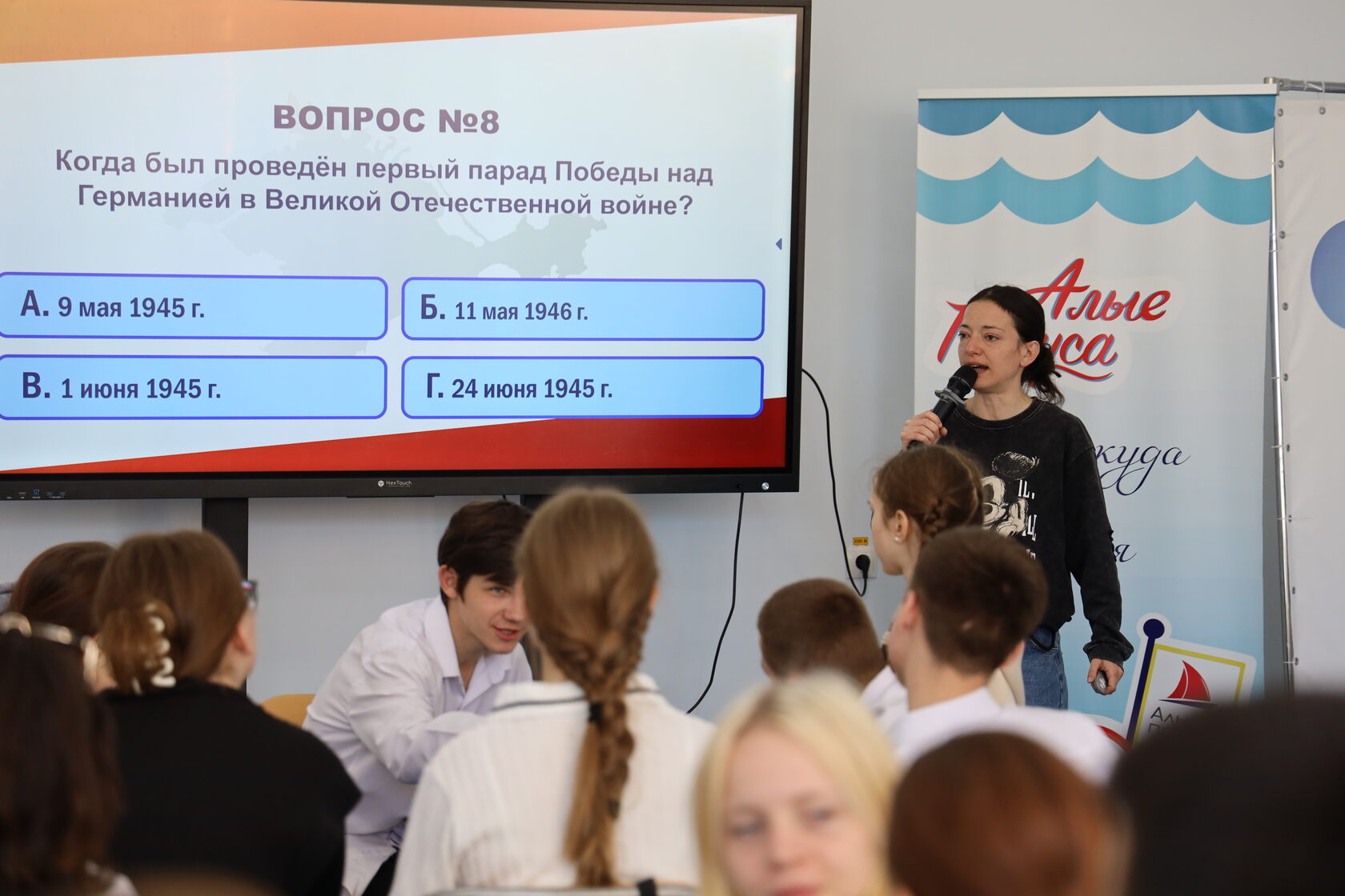 В рамках празднования Великой даты – 80-летия Победы в «Алых парусах» прошла интеллектуально-развлекательная игра, организатором которой стал АНО Дом Молодежи. Разделившись на команды, ребята прошли 3 раунда квиза, в каждом из них было определенное количество вопросов, касающихся знаний истории Великой Отечественной войны, дат и героев военных лет. Ребята не только отвечали на вопросы, но и открывали для себя новые исторические факты.