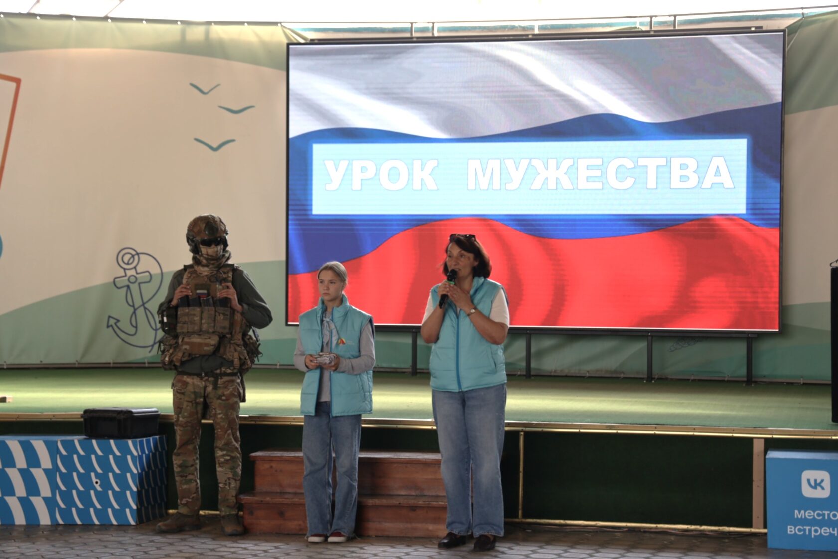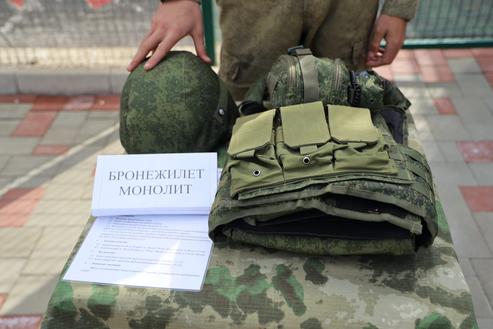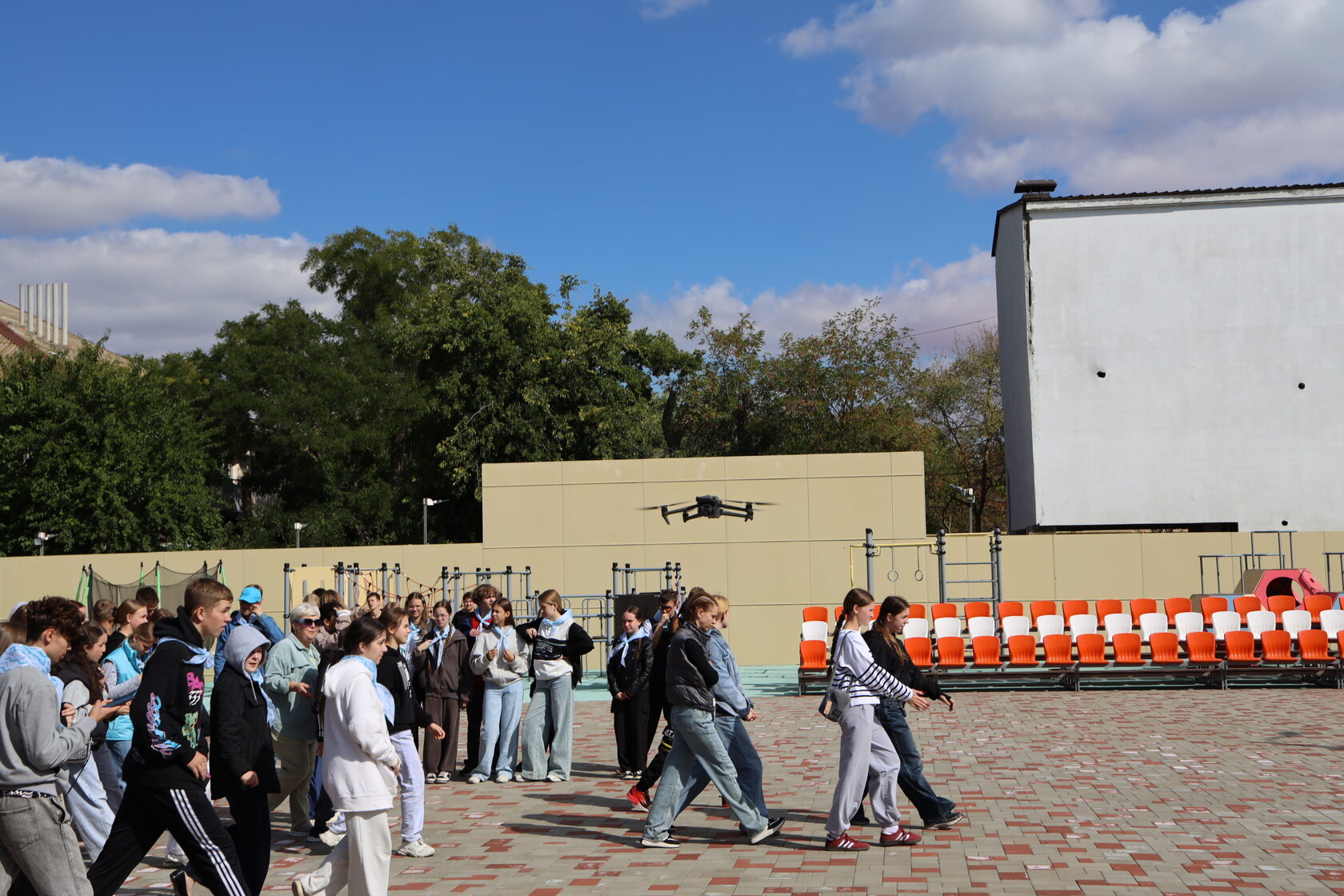 Сначала подросткам показали дрон в полёте, после чего продемонстрировали образцы современного оружия и военной формы. А часть обмундирования даже можно было примерить!