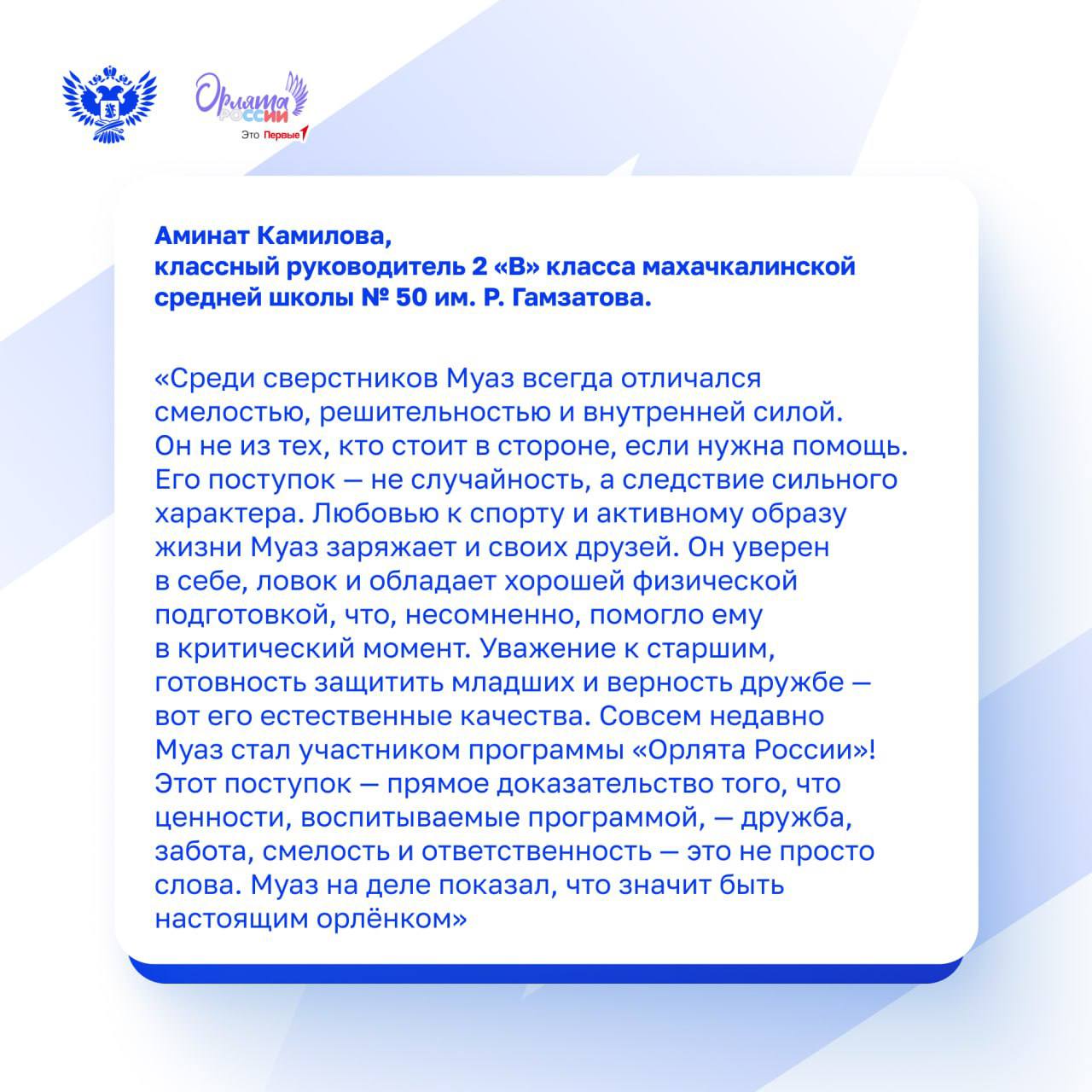 19 января на озере Ак-Гёль в Республике Дагестан 8-летний школьник совершил героический поступок. Во время игры на непрочном льду один из мальчиков провалился в ледяную воду. Рядом оказался ученик 2 «В» класса средней школы № 50 им. Р. Гамзатова г. Махачкалы Муаз Джангишиев.