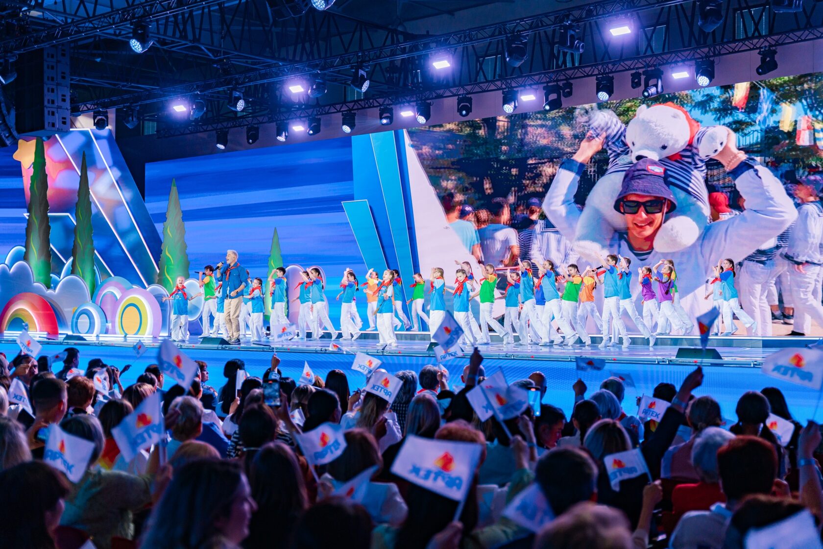 Министр просвещения РФ Сергей Кравцов поднялся на сцену вместе с Валентиной Николаевной Черкасовой. Ребенком она пережила блокаду Ленинграда, а после войны, в 1949 году, отдыхала в «Артеке». Вместе они исполнили песню «Артековская клятва», написанную журналистами «Пионерской правды» Владимиром Богановым и Анатолием Ануфриевым.