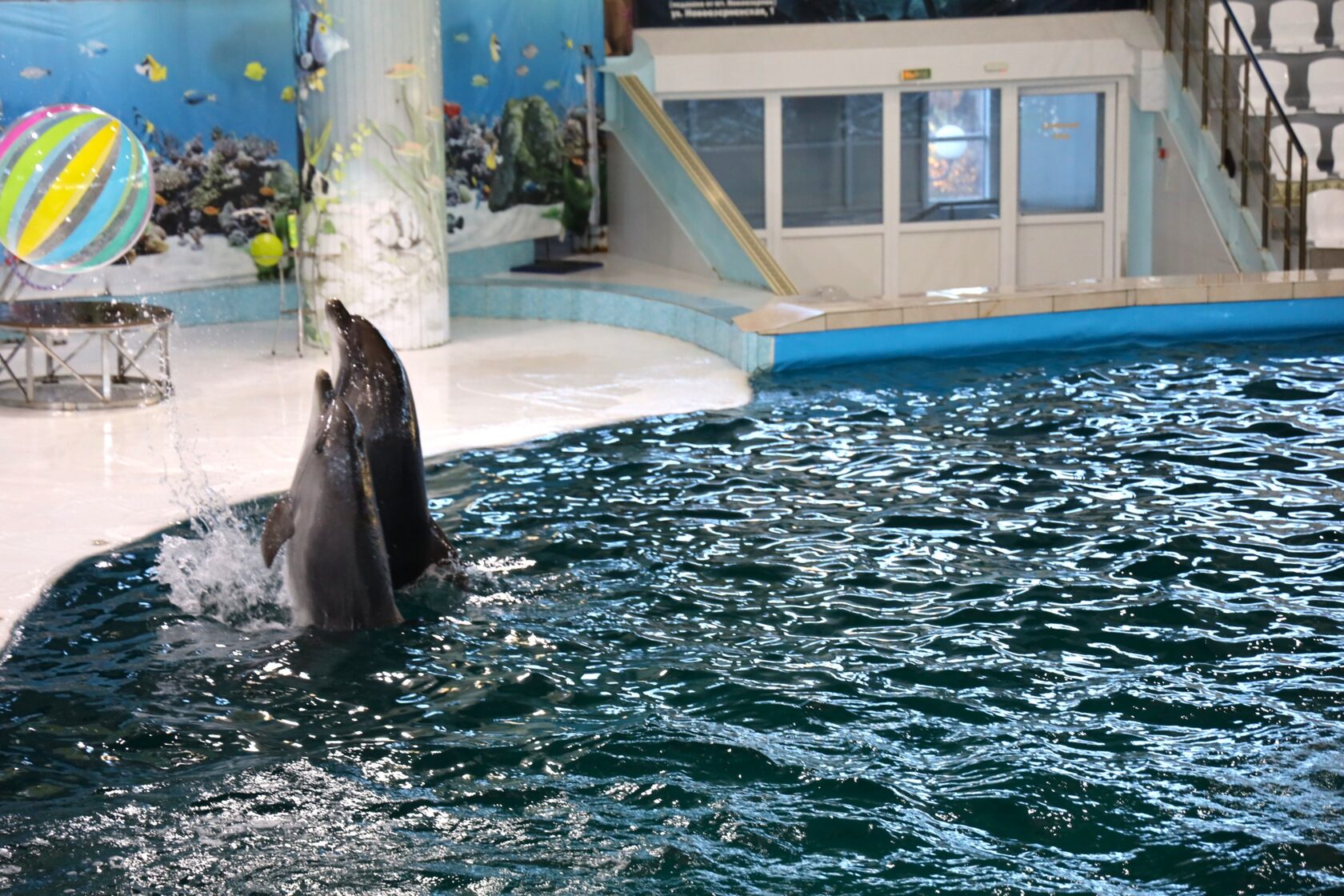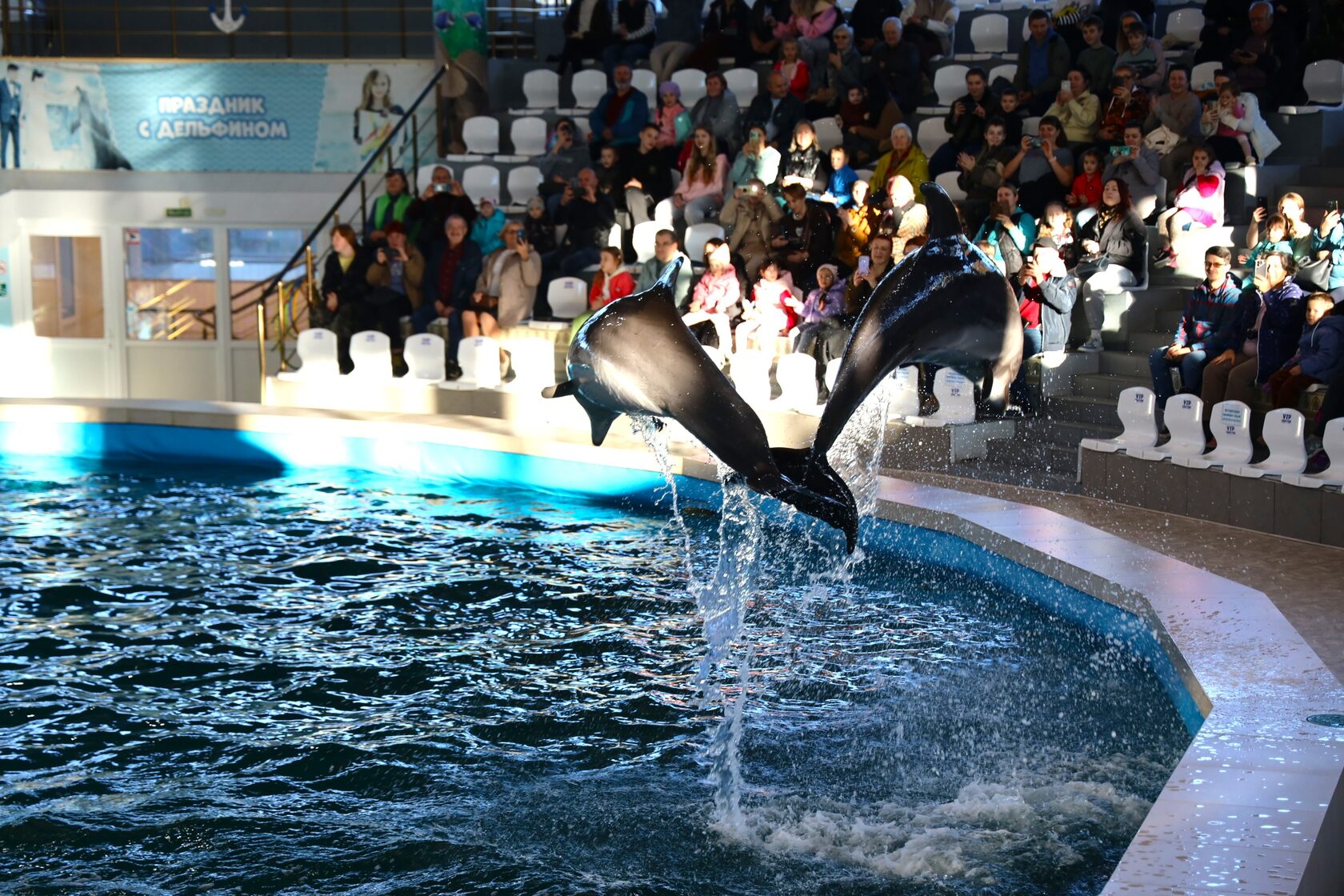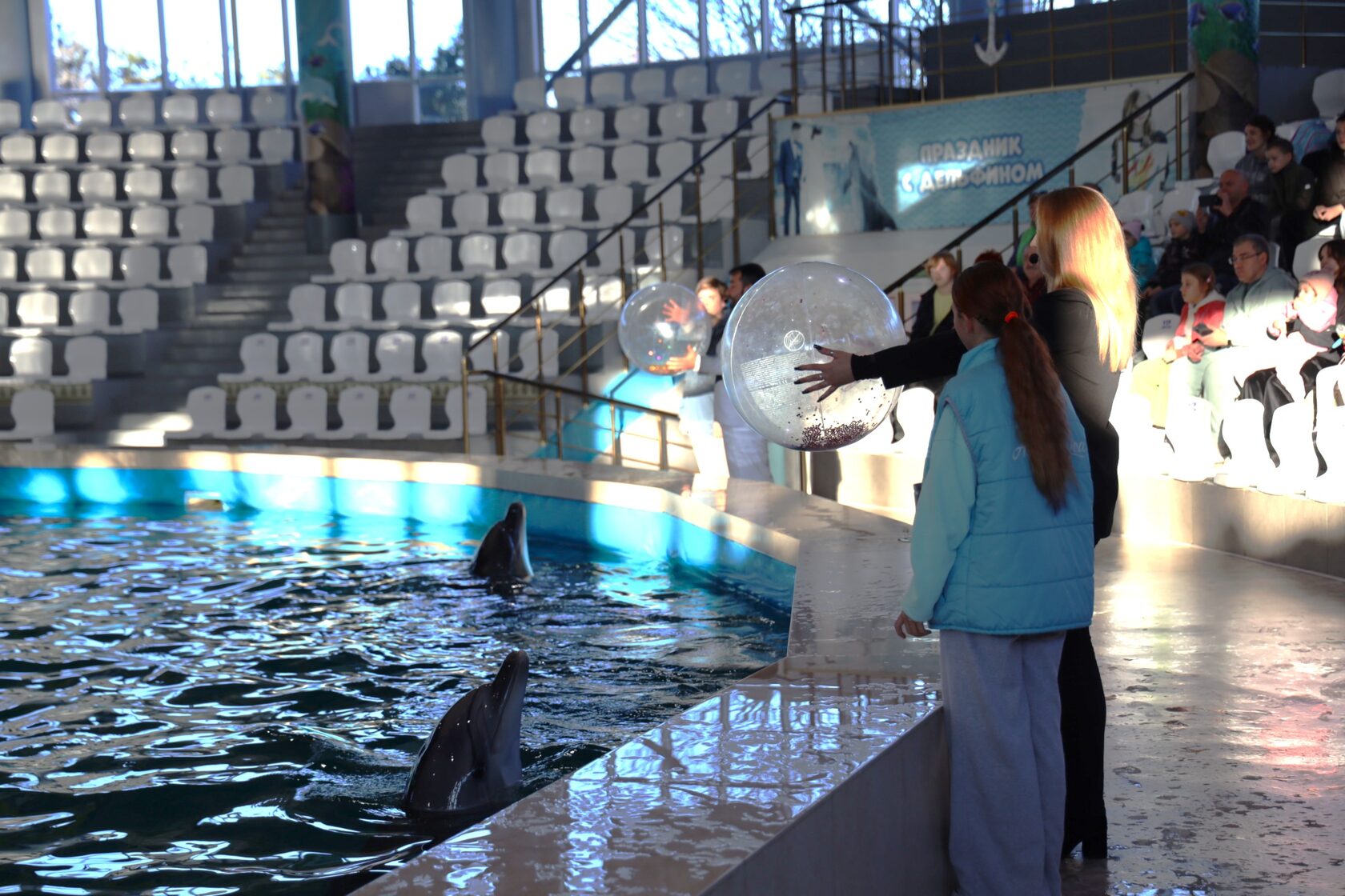 Особо красочным стал тандем тренеров и дельфинов на сцене. Люди показали, какими зрелищными могут быть совместные прыжки, игры и трюки с одними из самых умных млекопитающих.