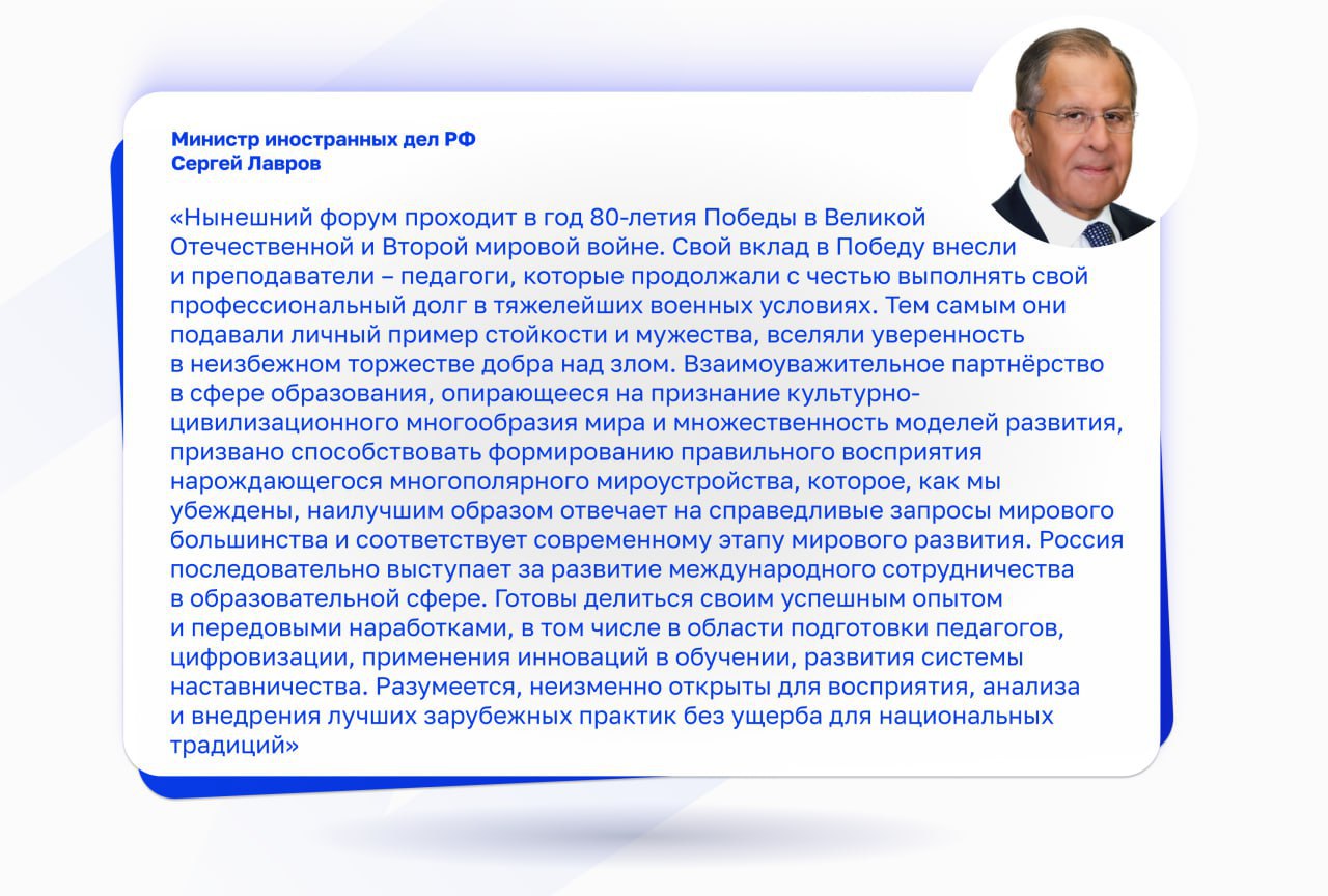 Сергей Кравцов: Ещё в 9 странах — в Бразилии, Армении, Монголии, Джибути, Омане, Катаре, Бахрейне, Саудовской Аравии, ОАЭ — появились центры открытого образования на русском языке и обучения русскому языку. Всего в проекте участвуют уже более 60 стран, заявил Сергей Кравцов на пленарном заседании III Международного форума министров образования «Формируя будущее».
