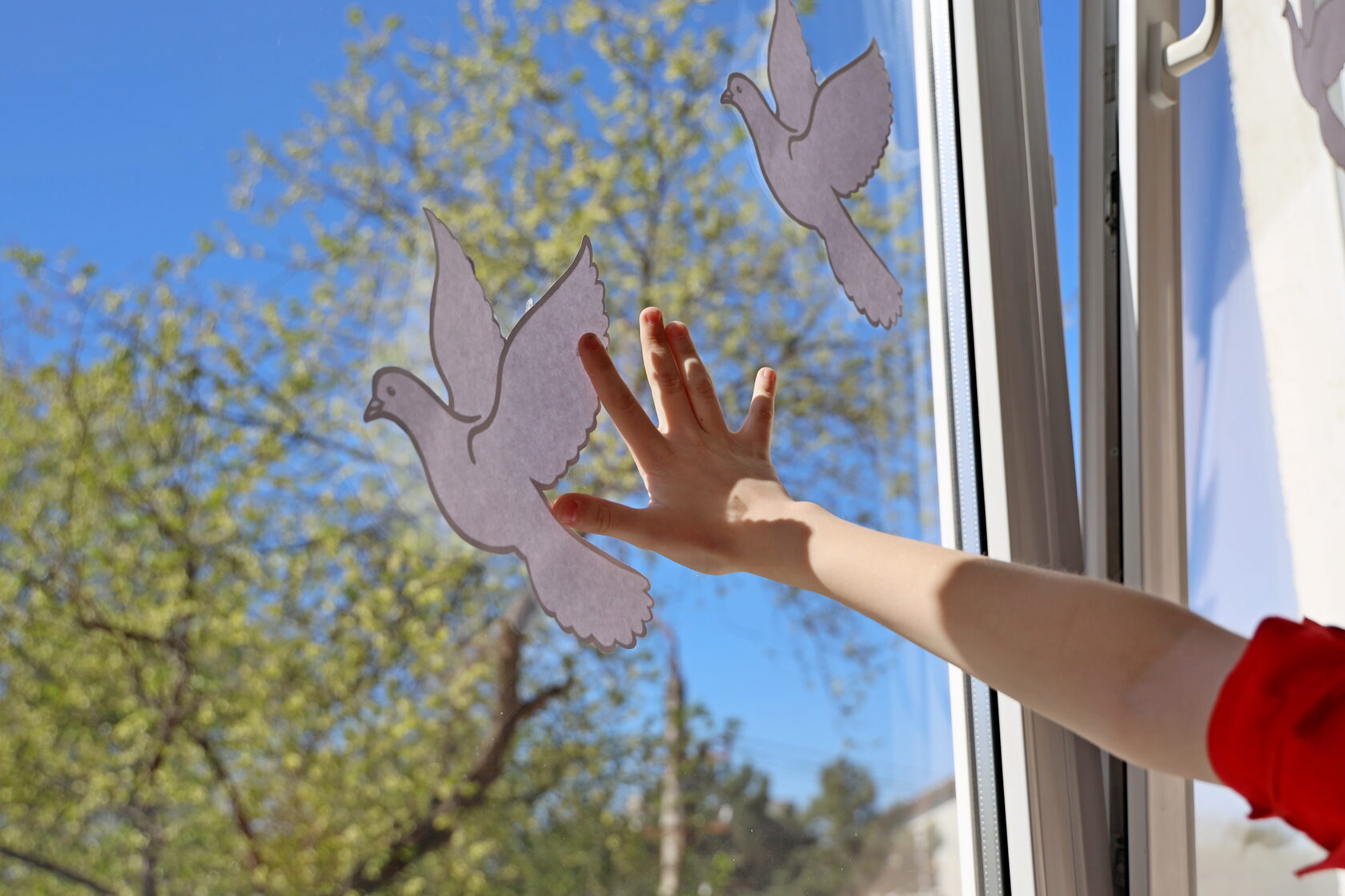 Окна школы вновь украшены символами Победы: георгиевскими лентами, цветами, звездами, печально взметнулись ввысь голуби мира и журавли, символизирующие память о павших воинах.