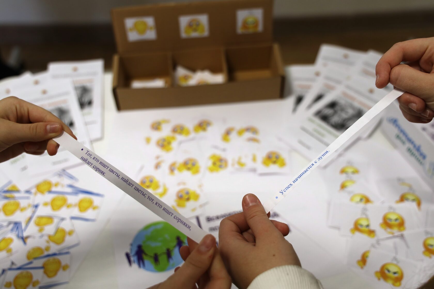 Так, при входе в школу ребят уже ждал «индикатор» эмоций, где они отмечали, является ли их настроение хорошим, нормальным или плохим. Если настроение было плохое – ребенок получал брошюру, в которой находились советы по борьбе со стрессом и паническими атаками, однако таких почти не было. Все дети также могли воспользоваться «эмоциональной аптечкой», в которой хранились как добрые пожелания, так и советы по пониманию себя и других.