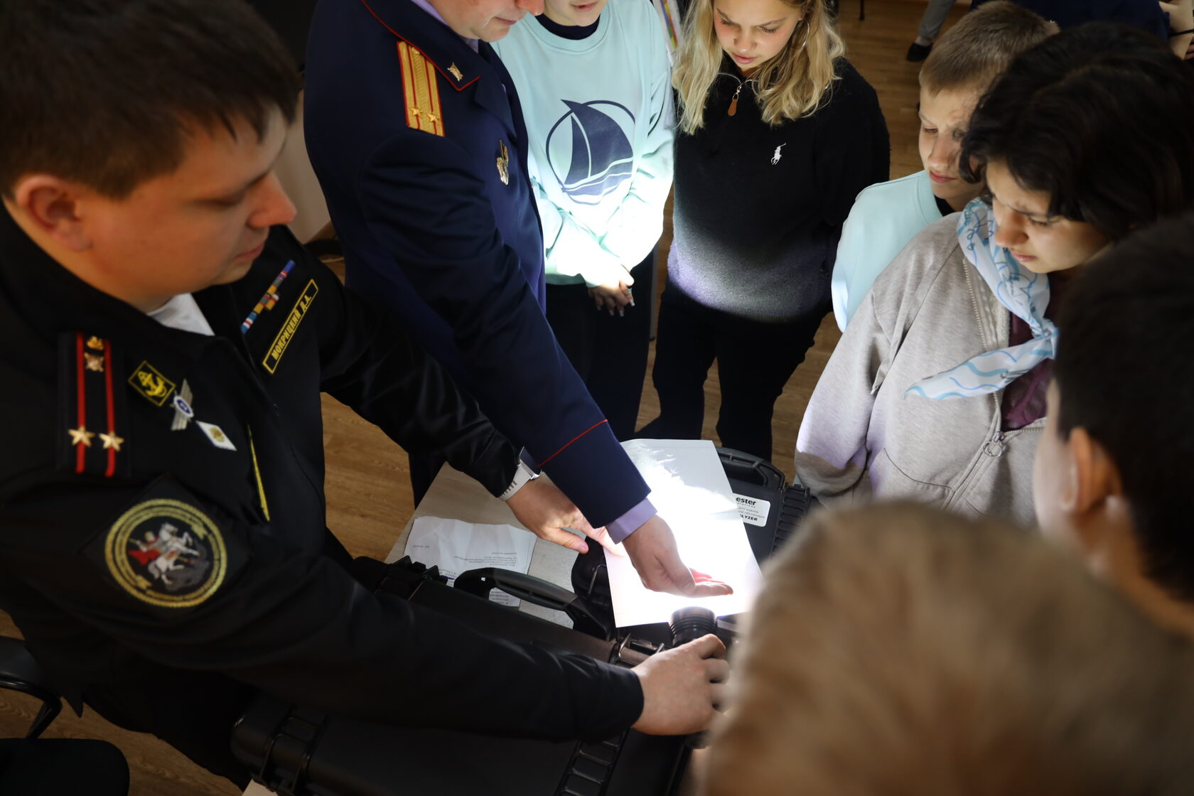 Эксперты на практических примерах показали ребятам, как выявлять отпечатки и биологические следы с помощью света. Как они выглядят под разными видами освещения и даже через линзу особой камеры, созданной специально для поиска следов.